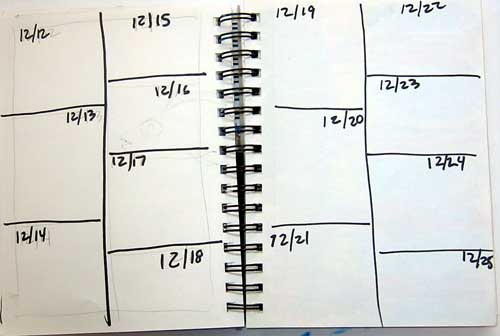 Step2: Divide each page up into seven boxes, one for each day of the week. Then date each box starting with Monday and go through Sunday. Repeat the same process on the adjacent page.