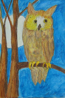 One the favorite birds for students to draw is the owl, in this lesson we are inspired by wildlife artist Robert Bateman. Great Horned Owl does not really have “horns” but tall tufts of feathers. When disturbed, the owl raises the tufts and sits very still so it can blend into the tree bark and hide. When it flies, the tufts are flat against the head. This owl has a wingspan of 3 feet but only weighs 9 ounces! Their lifespan is 25-30 years. I like to use watercolor materials for this project.
