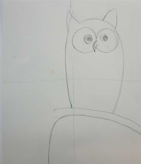 Step #1: Draw some light guidelines down the center of the paper and through middle. Start with a curved line for the branch and a large oval for the owl.