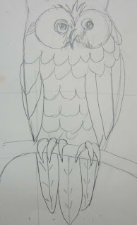 Step #3: Draw feathers and wings. Then continue below the branch with the owls tail feathers. (I use a scallop or “U” shape to create some of the feathers)