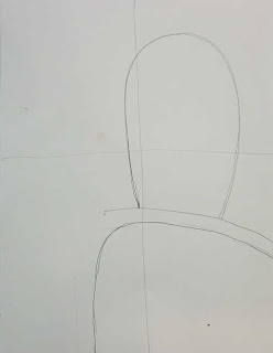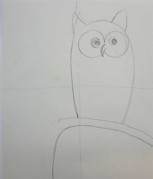 Step #1: Draw some light guidelines down the center of the paper and through middle. Start with a curved line for the branch and a large oval for the owl.