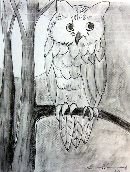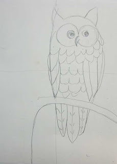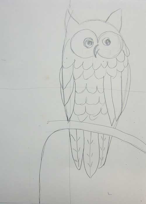 Step #3: Draw feathers and wings. Then continue below the branch with the owls tail feathers. (I use a scallop or “U” shape to create some of the feathers)