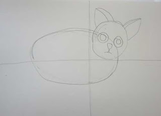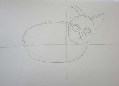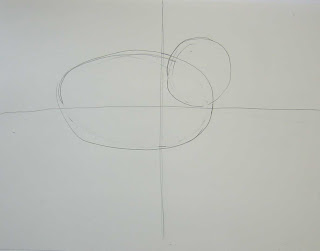 Step #1: Draw light guidelines down the center and across the middle of page. Draw a large oval in the middle and overlap a circle as shown.