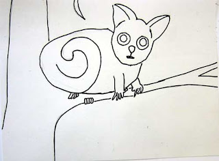 Step #4: Draw the rest of the tree and any of your own details. Remember the bush baby is nocturnal, so he is only active at night.