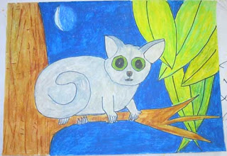The Senegal Bushbaby which is a small, nocturnal primate. The name “bush baby” may come either from the animals’ cries or from their appearance. They are agile leapers, and run swiftly along branches. They live in Africa south of the Sahara and nearby islands including Zanzibar. They tend to live in dry woodland regions and savannah regions. They are small primates with woolly thick fur that ranges from silvery grey to dark brown. They have large eyes, giving them good night vision; strong hind limbs; and long tails, which help their balance. In this lesson we work on scale and proportion of the Bush Baby, using color to create space and depth.