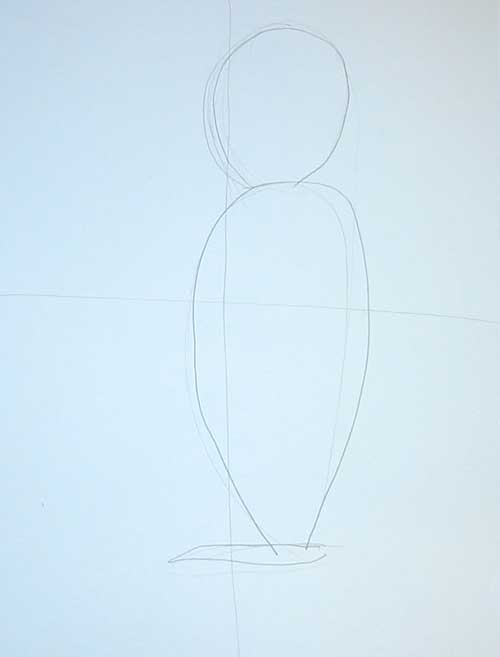 Step #1: Draw light guidelines down the center and across the middle of the paper with sketching pencil. Draw a circle for the head and a large skinny oval for the body.