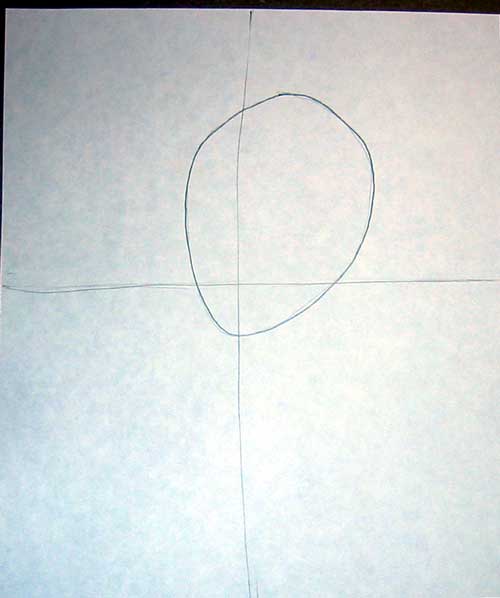 Step #1: Draw a light guideline across the middle and down the center of your paper. Draw a egg shape oval near the center with a slight tilt.