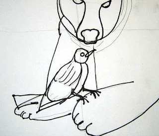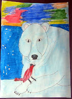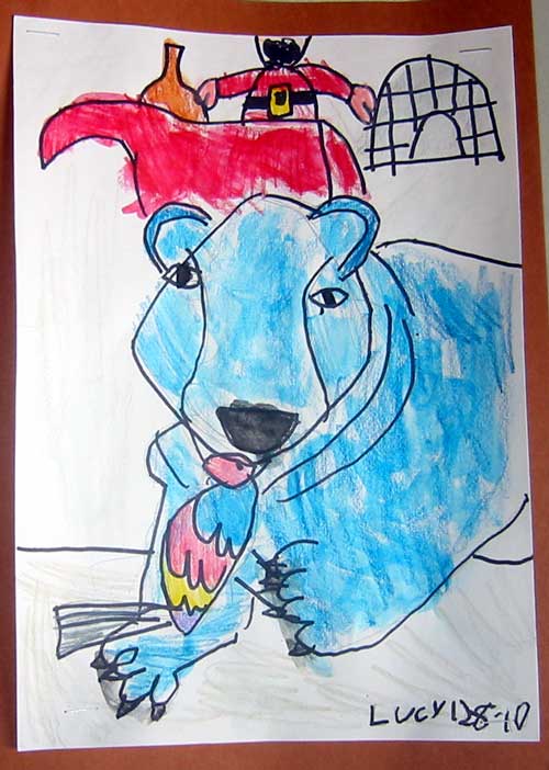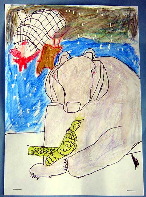 Step #3: Draw the bird with a circle for the head and a oval for the body. Add the eye and the beak to head. Draw wing and tail feathers. Draw talons on the polar bear paw.