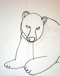 Step #1: Draw light guidelines across the center and down the middle. Draw a large oval for polar bear head. Draw eyes, snout and ears.