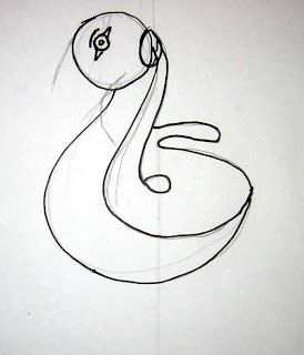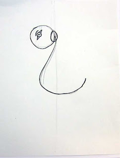 Step #2: Draw a oval off the right side of the head, attach a line in the shape of a backward “J” for the body.