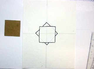 Step #1: Draw guidelines down the center and across the middle of the page. Use a ruler to make a 3″ square template. Outline the 3″ square template where your guidelines intersect. Then take your 3″ template and turn it 90 degrees clockwise and outline it again as shown below.