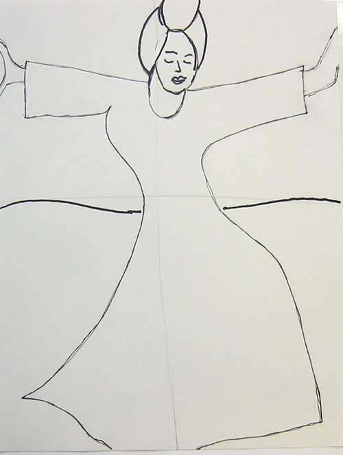 Step #4: Draw the eyes being closed, nose and mouth. Add her head wrap and the horizon line behind the dancer..