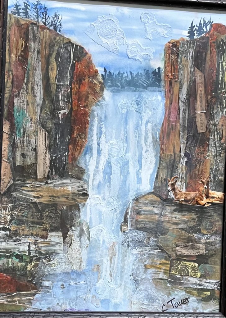 Christine: My favorite piece is a large work of art called, “Falling Waters.” This piece took a great deal of work as we made our own papers to create the cliffs with some of the papers using words as background. Then I started the work by using watercolor to create a sky at the very top. Next, I cut up the papers and used them to create cliffs on each side of where the waterfall would be. I used watercolor to paint in some evergreen trees. Japanese circular, tufted paper was added to the sky and water that brought an element of texture and the effect of turbulent waters. Then I poured white ink from the top of the waterfall and sprayed water on the ink allowing it to flow over the “boulders” to create a realistic effect of spray. The final touch was a pair of goats from a photograph that I had taken in Utah. I really worked hard to create contrast in the rock formations to simulate depth. It is just one of my favorite pieces.