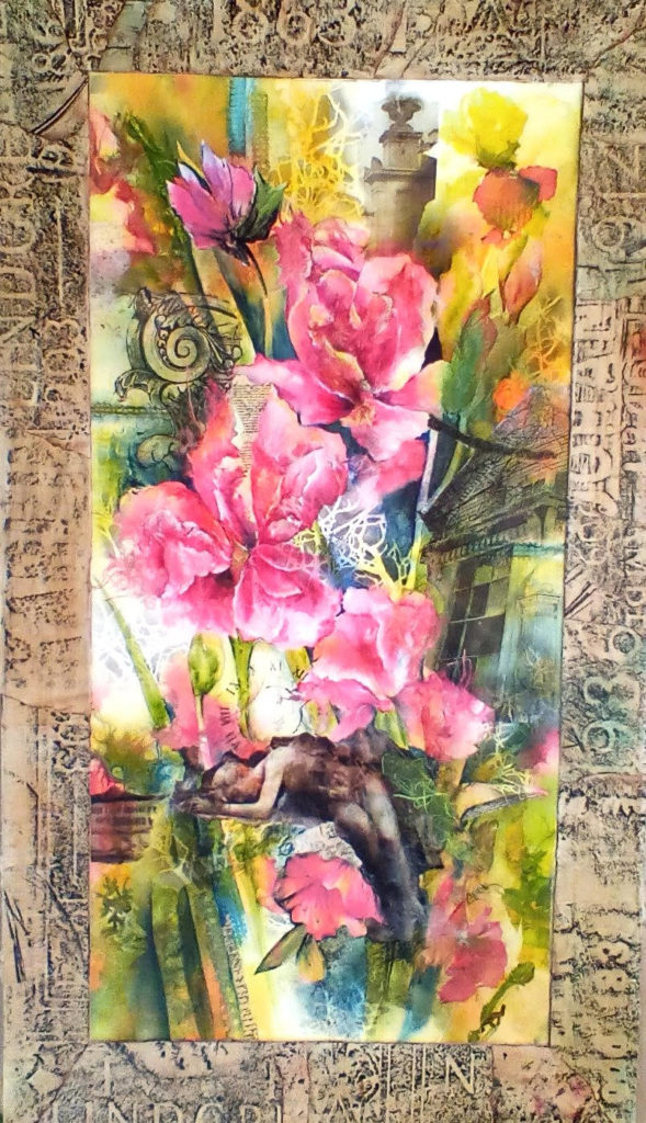 Cherene: In all honesty my favorite is a piece that I had started but it always aggravated me. “How do you know when a piece is finished? When it quits aggravating you!” The mixed media piece is titled “Midnight in the Garden”. The underpainting is watercolor with many layers of acrylic, collage, and stenciling. I never had an appropriate mat to pull the piece together. Together, Christine and I went it on a field trip to a local cemetery and took some head stone rubbings. I collage these onto the border of the work creating a mat. I’m now pleased with the results, and it has the moody feel of Savannah that I was trying to capture…. problem solved.