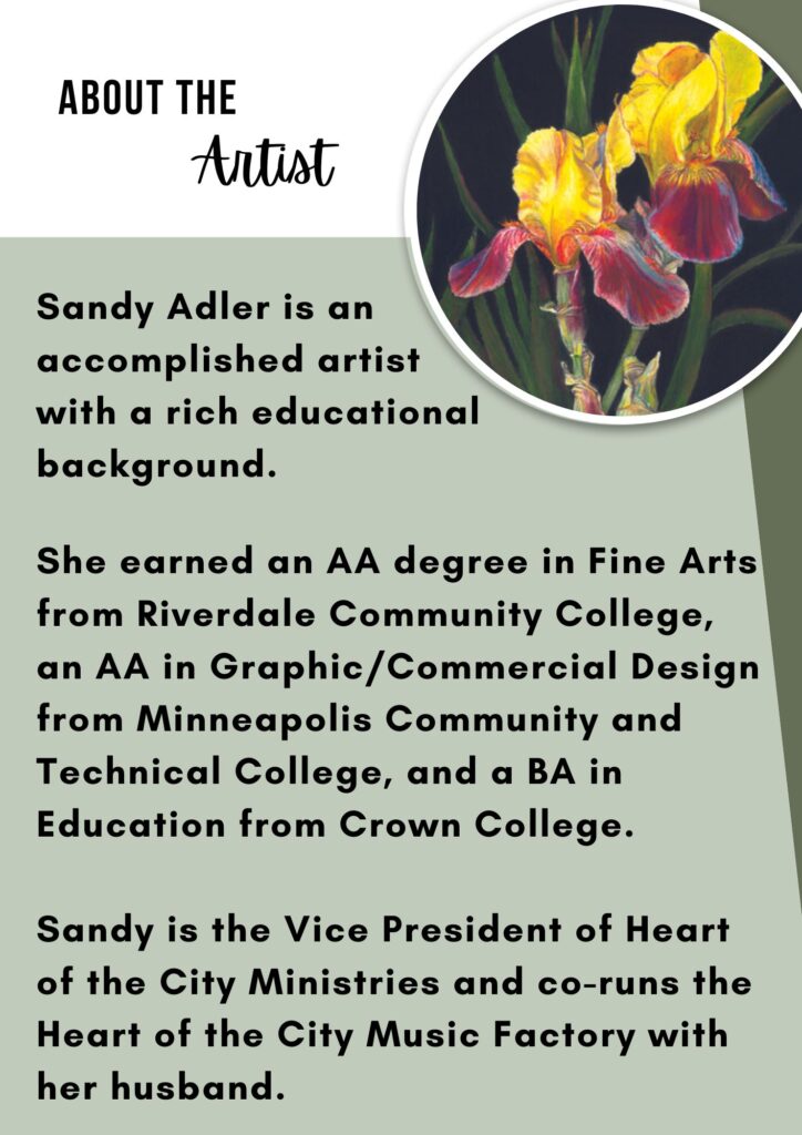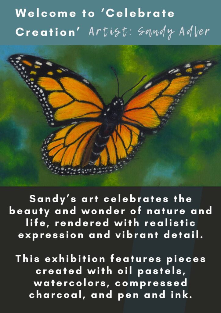 We invite you to join us for our upcoming events featuring Sandy Adler’s ‘Celebrate Creation’ gallery show. Located in the 21 Step Gallery at Rumriver Art Center.