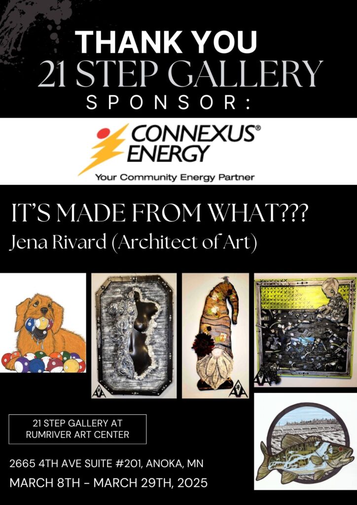 Thanks to the support of our 21 Step Gallery: Sponsor Connexus Energy, all gallery events are free and open to the community. Their generosity helps nurture creativity in the NW Metro, providing vital funding for studio space, gallery exhibitions, and art education.