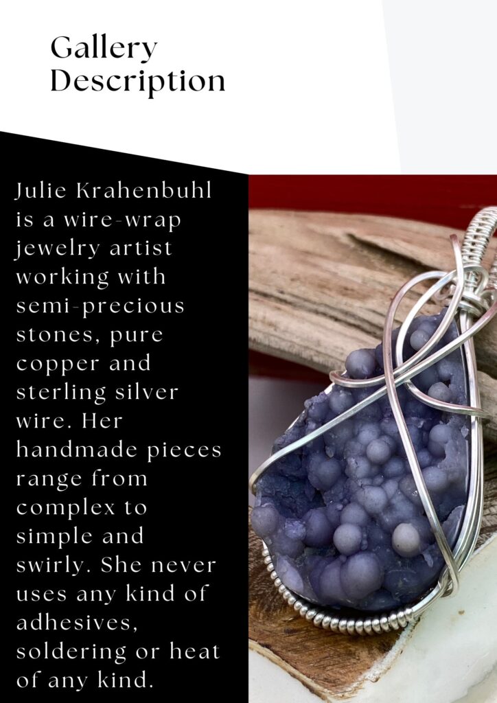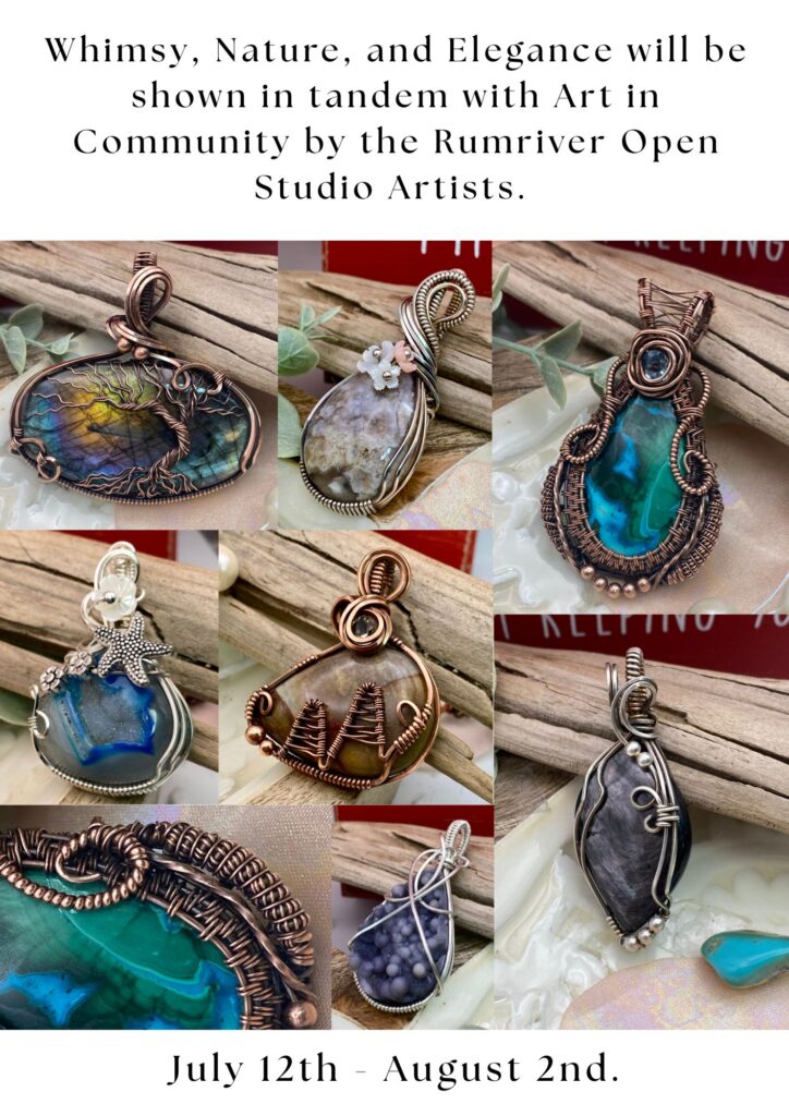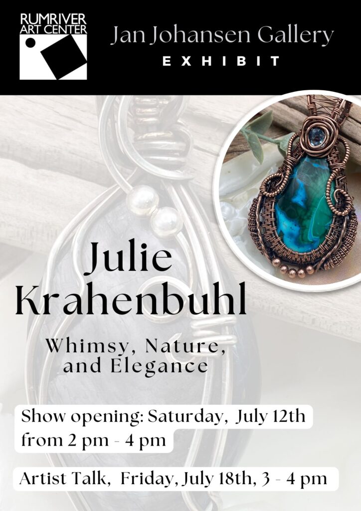 Rumriver Art Center is excited to welcome Whimsy, Nature, and Elegance by artist Julie Krahenbuhl to the Jan Johansen Gallery. Julie’s one-of-a-kind pieces—made entirely by hand without heat, glue, or solder—and are inspired by nature and the world around her.
