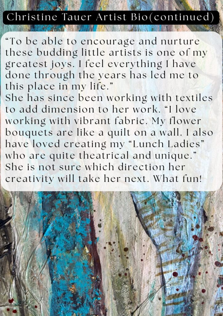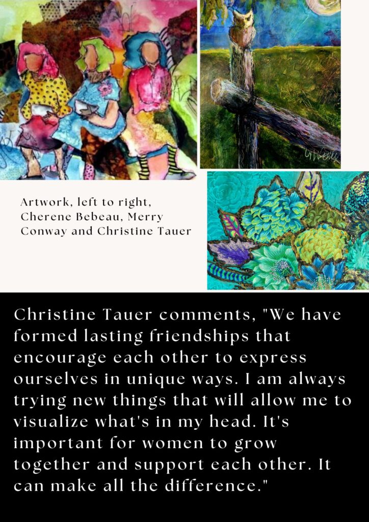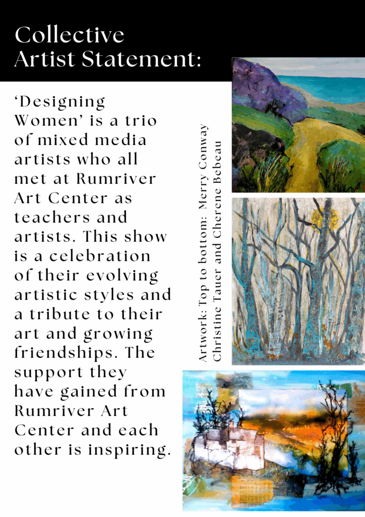 The Jan Johansen Gallery at Rumriver Art Center is proudly presents: Designing Women. Discover this compelling mixed-media exhibition by artists Cherene Bebeau, Merry Conway, and Christine Tauer. These three women met through Rumriver Art Center. Together they developed not only unique personal styles, but deep friendships that shapes and inspires their work.