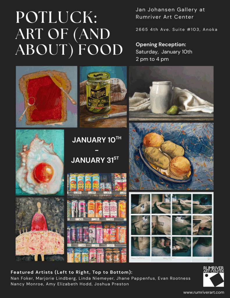Potluck: Art of (and about) Food, is Rumriver Art Center’s January group gallery show (Jan 10–31) in the Jan Johansen Gallery. Artists were invited to briefly introduce themselves and share one detail about their piece. *Filmed during a short optional window of time—so you’ll see some (but not all!) of the artists in the show.